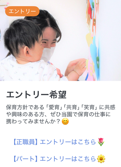 教育・保育方針である「愛育」「共育」「笑育」に共感や興味のある方、ぜひ当園で教育・保育の仕事に携わってみませんか?
